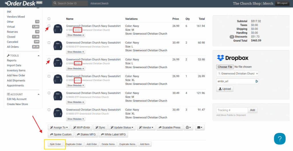 Always split orders that contain embroidery + non-embroidery items. Make sure that only the split orders tagged with “EMBR” are sent to the Digitizing Folder.