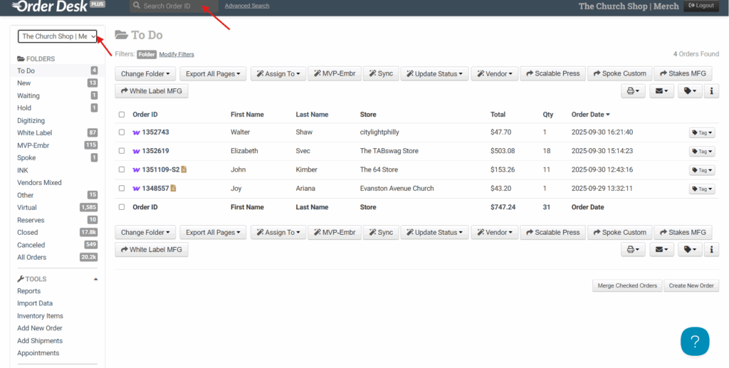 When you open the order desk, this is what you should see. Make sure you are in the TCS section if you are checking a TCS order. To check an Impact Merch order, click the dropdown menu and select it. Then, enter the Order ID to find the specific order.