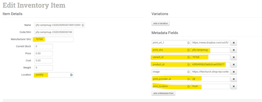 All camp mug orders are fulfilled through Printify. Most fields stay the same for every item, only a few need to be updated for each design.