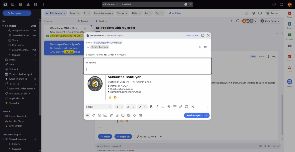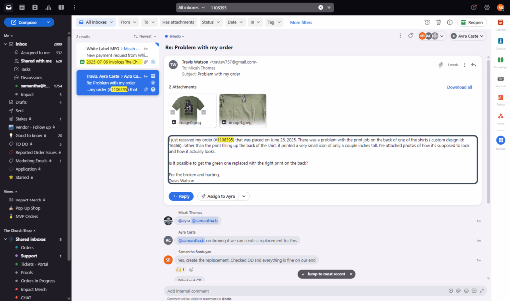 Reprint for Order #1106395 – Misprint on Front Design - Once sent, mark the email as Resolved in Front.