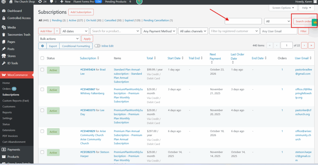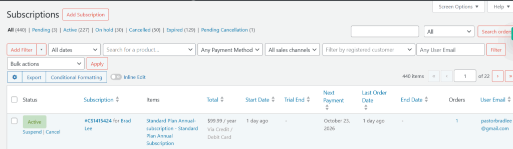 When a customer requests to cancel their subscription, follow this process to ensure both the subscription and their store membership are properly updated in WordPress and WooCommerce.